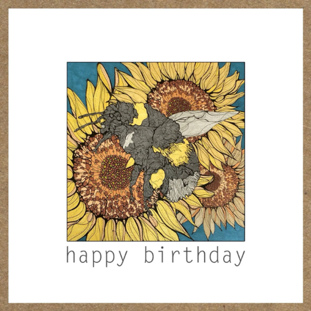 Bee and sunflower Birthday card. The design for this card originates from my art, starting as a black and white fine liner drawing it is then coloured in ink pens and digitally edited, creating what you see.