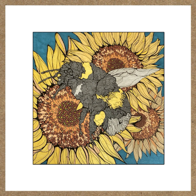 Bee and sunflower square blank card. The design for this card originates from my art, starting as a black and white fine liner drawing it is then coloured in ink pens and digitally edited, creating what you see.