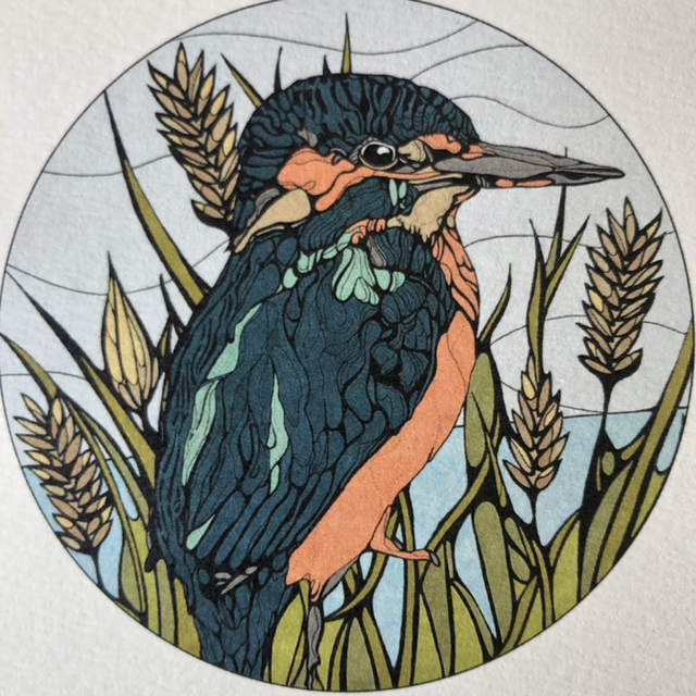 Kingfisher blank card. The design for this card originates from my art, starting as a black and white fine liner drawing it is then coloured in ink pens and digitally edited, creating what you see.