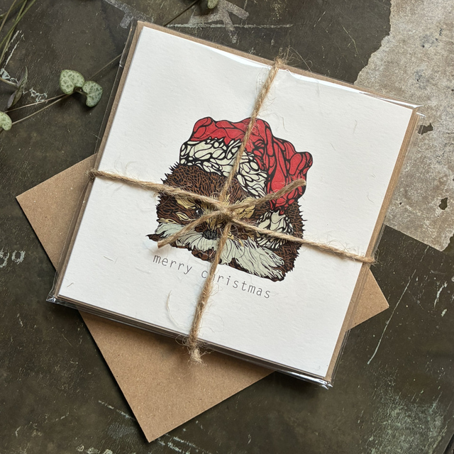 6 pack of hedgehog Christmas cards. The design for this card originates from my art, starting as a black and white fine liner drawing it is then coloured in ink pens and digitally edited, creating what you see.