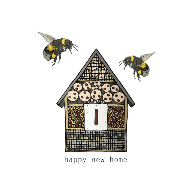 New home bee card. The design for this card originates from my art, starting as a black and white fine liner drawing it is then coloured in ink pens and digitally edited, creating what you see.