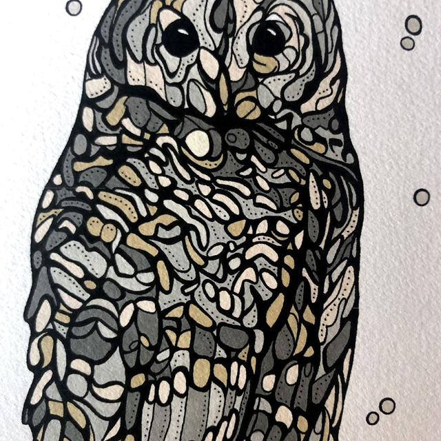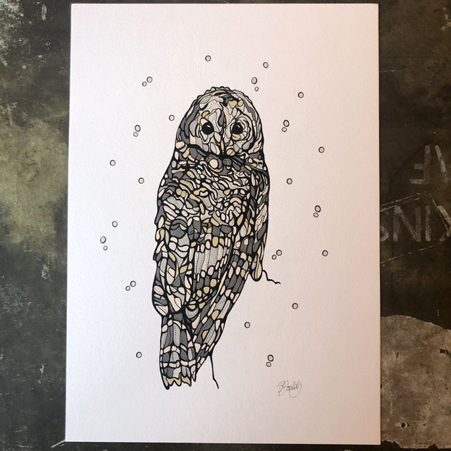 Owl hand-coloured print, signed and unique. This is a print of my black and white fine liner drawings, that I have then edited, printed and added to using coloured ink. This is a one off and part-original (with the colour element being original). I have chosen to colour each print of my drawing individually as I like the vibrant colours and uniqueness this gives to each – I also enjoy knowing that I have put a lot of time into each piece as each takes about two and a half hours to colour, and the original black and white drawings about 12 hours.