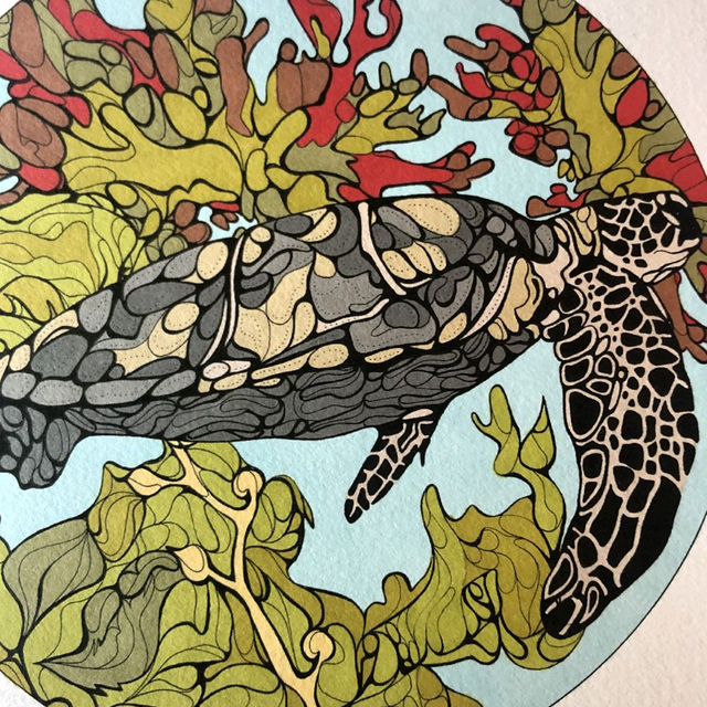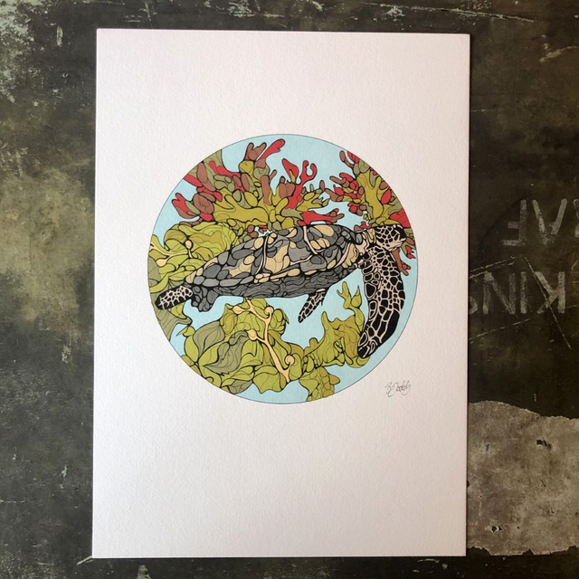 Sea turtle hand-coloured print, signed and unique. This is a print of my black and white fine liner drawings, that I have then edited, printed and added to using coloured ink. This is a one off and part-original (with the colour element being original). I have chosen to colour each print of my drawing individually as I like the vibrant colours and uniqueness this gives to each – I also enjoy knowing that I have put a lot of time into each piece as each takes about two and a half hours to colour, and the original black and white drawings about 12 hours.